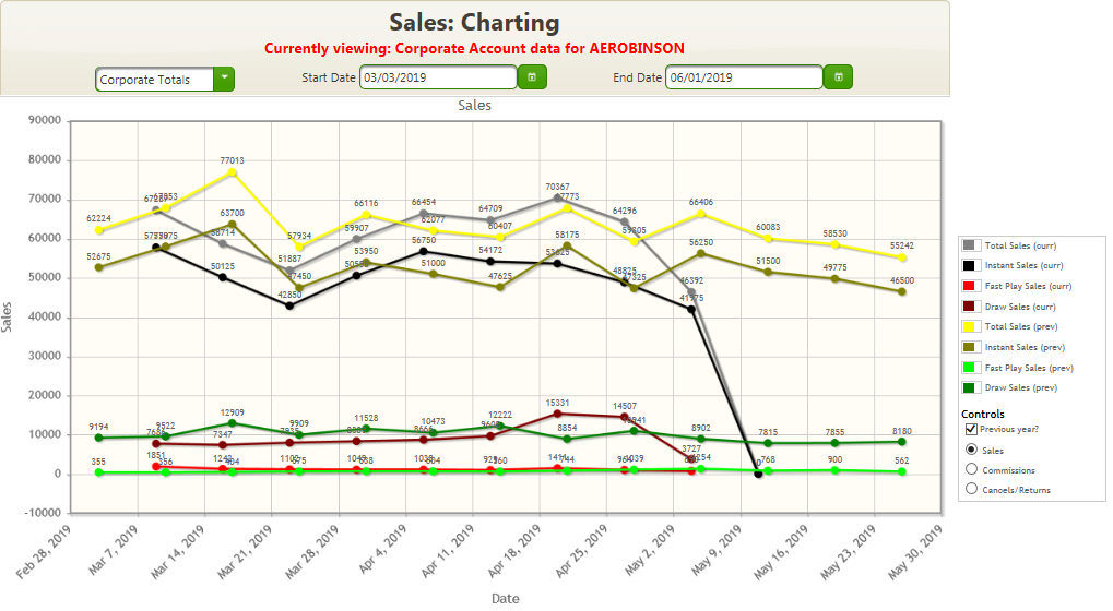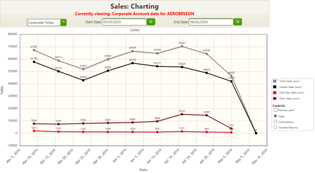 The Charting page displays a graphical representation of sales, commissions, and cancels, which are broken down as Instant, Fast Play, draw, and total sales (the sum of each game type's sales that week).